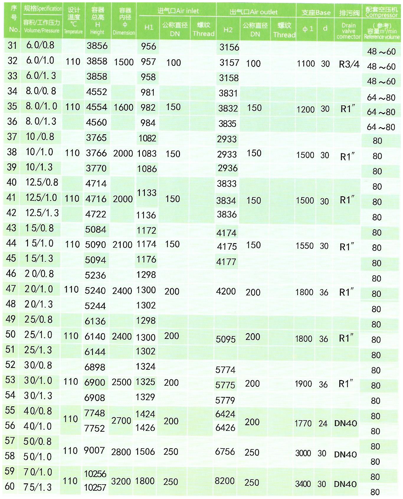 2、排氣量在6~10m3/min以下使用1500L~2000L儲氣罐。